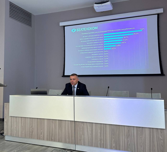З асвятленнем дадатковай тэмы аб выніках ацэнкі задаволенасці персаналу РУП « Белтэлекам» (Апытанне-2025), рэалізацыі Палажэння аб настаўніцтве ў РУП « Белтэлекам» выступіў начальнік упраўлення па працы з персаналам Лісаў Міхаіл Мікалаевіч.