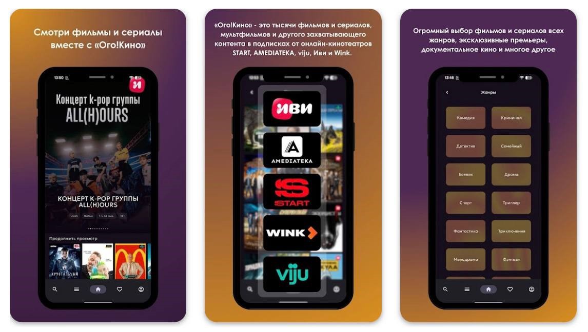 «Ого!Кино» объединяет контент пяти популярных кинотеатров – START, AMEDIATEKA, Иви Лайт, Wink Лайт и viju. В каталоге представлены новинки, классика, детские передачи и эксклюзивные сериалы.