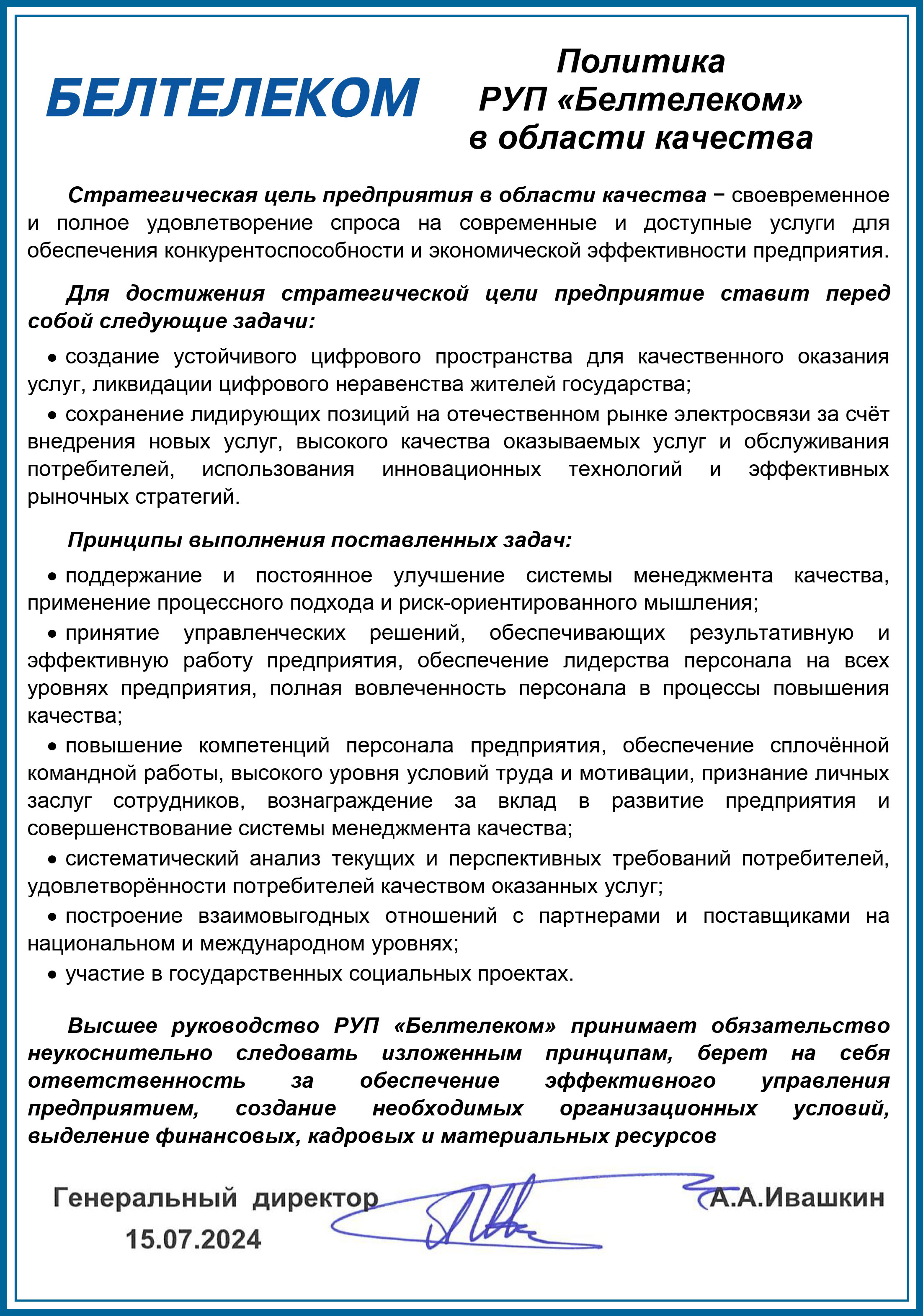 Политика РУП «Белтелеком» в области качества