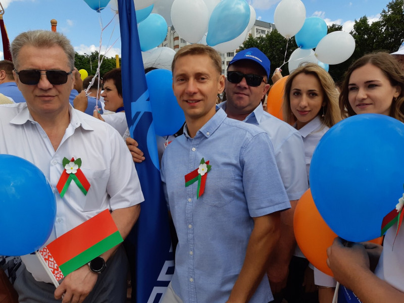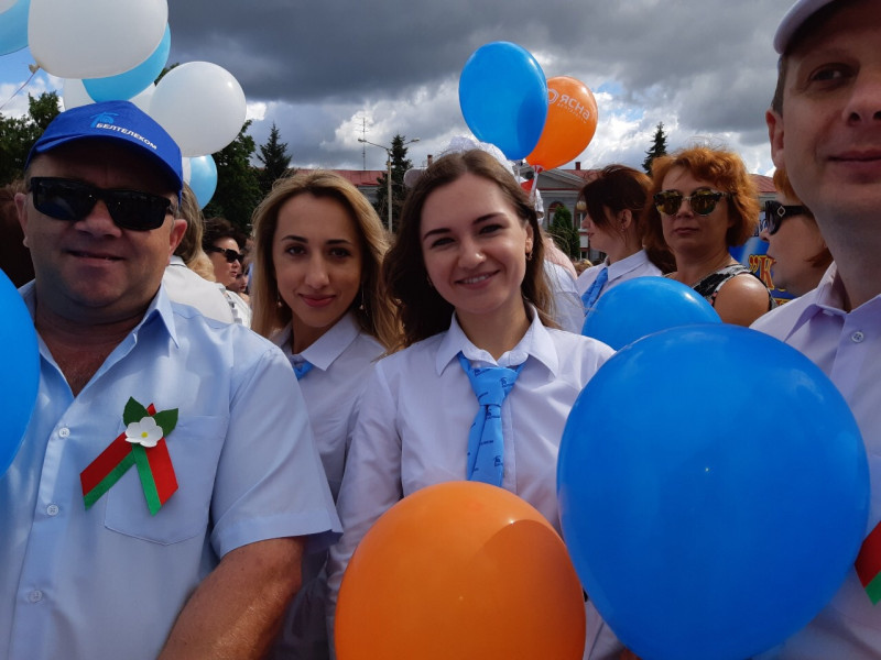 Главный государственный праздник Республики Беларусь - День независимости, в этом году совпал со знаменательной датой - 75-летием освобождения Республики Беларусь от немецко-фашистских захватчиков. На ряду с другими городами страны, этот праздник отмечали и в городе Калинковичи Гомельской области. Празднование началось с митинга, который открыла группа флагоносцев, офицеров военного комиссариата района, которые торжественно внесли Государственный флаг Республики Беларусь и флаг СССР как страны, которая победила в войне. Свои поздравления с Днем Независимости, адресованные жителям и гостям города и района, произнес председатель Калинковичского райисполкома Сергей Александрович Гвоздь. В рамках митинга по площади прошла военная и мирная техника. А также в ходе мероприятия зрителям было показано театрализованное представление с участием представителей большинства организаций города. Завершили праздничный митинг шествием колон трудовых коллективов ведущих предприятий и организаций района. Среди участников праздничного шествия были и представители коллектива Калинковичского зонального узла электросвязи во главе с начальником Змушко Сергеем Владимировичем. Праздничная программа на различных площадках города продлилась до позднего вечера и завершилась красочным фейерверком. Печать