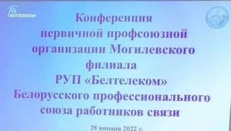 28 января 2022 года состоялась отчётная конференция в первичной профсоюзной организации Могилёвского филиала РУП Белтелеком за период с октября 2019 по январь 2022. С докладами о работе профсоюзного комитета ППО Могилёвского филиала РУП Белтелеком за период с октября 2019 по январь 2022 выступили председатель первичной профсоюзной организации Владимир Кива и председатель ревизионной комиссии Лариса Минаева. Для ведения конференции были избраны президиум, секретариат, мандатная комиссия , редакционная комиссия, счётная комиссия. В состав президиума были избраны: директор филиала Валерий Борисовец, председатель первичной профсоюзной организации Могилёвского филиала РУП Белтелеком Владимир Кива, начальник ГРКК коммерческой службы Владимир Цой, электромеханик Сергей Порхунцов и электромеханик Инна Иванова, приглашенный заместитель председателя первичной профсоюзной организации РУП "Белтелеком" Борис Титов. На повестке дня обсуждались следующие вопросы: о работе профсоюзного комитета, о работе ревизионной комиссии, об исполнении сметы доходов и расходов за 2021 год, об утверждении сметы доходов и расходов на 2022 год. Обсуждался вопрос о предстоящем Референдуме, и об изменениях в Конституцию Республики Беларусь. Работа профсоюзного комитета первичной профсоюзной организации Могилёвского филиала РУП "Белтелеком" признана удовлетворительной. Печать