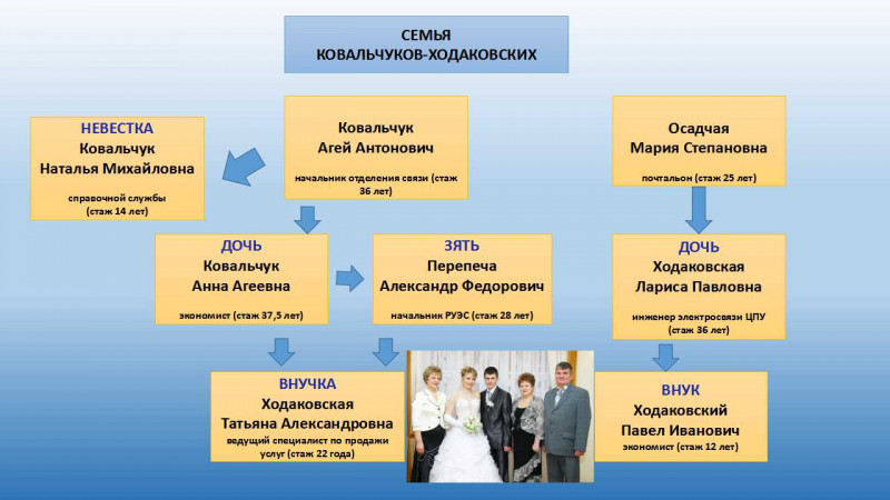 В этом году РУП «Белтелеком» празднует 25-летие. Мы начинаем новую рубрику «ДИНАСТИИ». И хотим рассказать о династии Ковальчук-Ходаковских. Общий трудовой стаж этой замечательной семьи - 210,5 лет. 3 поколения большой и дружной семьи трудились и трудятся в Гомельском филиале РУП "Белтелеком". Ковальчук Агей Антонович 1926 года рождения (ушел из жизни в 2016 году в возрасте 90 лет) стал основоположником этой династии. Стаж работы в отрасли связи 36 лет (1950-1986). Война и служба в армии сократили его связистский стаж. В 1942 году в возрасте 16 лет был угнан на принудительные работы в Восточную Пруссию г.Кениксберг. Жил и работал в легере. Из его воспоминаний о пребывании в лагере: «Работали по 18 часов в сутки, работа тяжелая, кормили очень плохо. В магазинах продукты были только по карточкам. Иногда, пожилые немки поддерживали, проходя мимо, незаметно бросали под ноги продуктовые карточки и мы ногой тихонько закрывали незаметно поднимали, а затем отоваривали. Когда Советские войска нас освободили, сил самостоятельно передвигаться не было,наши солдаты несли на руках около 2-х километров до пункта назначения. Видя как им тяжело нести просил: «Да бросьте меня здесь!», но наши солдаты никого не оставили, а ведь я не один был в таком состоянии». После освобождения частями Светской армии сразу был призван на действительную службу штабом 3-го Белорусского фронта. После Победы продолжил службу в рядах Советской Армии до 1950 года. Узник и участник ВОВ,имеет многочисленные награды. Во время службы в Армии 2 года был телефонистом, это может и определило его дальнейшую судьбу. И в том же 1950 году принят на должность райорганизатора в Наровлянскую контору связи. Работал на различных должностях. В 1963 году переведён на должность начальника Вербовичского отделения связи Наровлянского районного узла связи, где и проработал до выхода на пенсию и был уволен в связи с аварией на Чернобыльской АЭС (зона обязательного отселения). За время работы неоднократно был победителем соцсоревнований, награждался грамотами, неоднократно был на доске почёта не только Наровлянского РУС, но и Наровлянского района. По стопам отца пошла и его старшая дочь – Ковальчук Анна Агеевна, 1955 года рождения. Еще, учась в 10 классе, работала почтальоном, разносила газеты и журналы вместе с младшим братом. В те годы периодическую печать выписывала каждая семья и не по одному экземпляру. В 1972 году закончила школу, работала начальником отделения связи, а с 1973 года нормировщиком Наролянского районного узла связи. Закончила техникум связи. В 1982 году переехала в г.Гомель и была принята на должность экономиста планово-финансового отдела Гомельского управления связи. С 1996 по 2010 годы – экономист отдела экономики Гомельского филиала «Белтелеком». Стаж в отрасли связи 37 лет. Неоднократно награждалась почётными грамотами и благодарностями Гомельского филиала РУП «Белтелеком» и Гомельского облисполкома. В настоящее время на заслуженном отдыхе и является председателем Совета ветеранов Гомельского филиала РУП «Белтелеком». Еще, работая в Наровлянском РУС, познакомилась со своим будущим мужем Перепечей Александром Федоровичем 1952 года рождения, который в то время работал заместителем начальника Наровлянского цеха электросвязи. Затем работал начальником цеха, а с 1996 года Начальником Лельчицкого РУЭС. Неод
