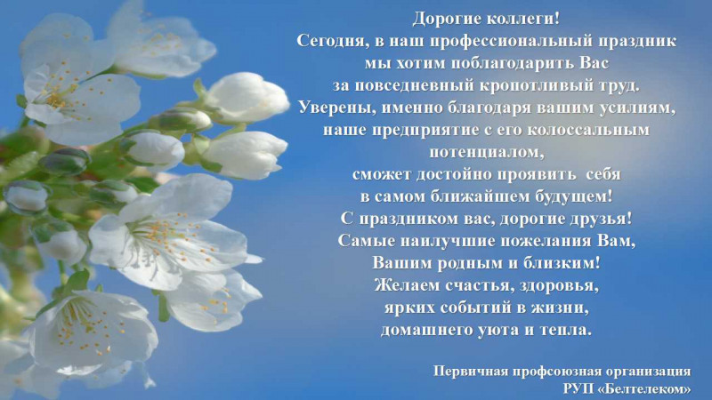 Дорогие коллеги! Сегодня, в наш профессиональный праздник мы хотим поблагодарить Вас за повседневный кропотливый труд. Уверены, именно благодаря вашим усилиям, наше предприятие с его колоссальным потенциалом, сможет достойно проявить себя в самом ближайшем будущем! С праздником вас, дорогие друзья! Самые наилучшие пожелания Вам, Вашим родным и близким! Желаем счастья, здоровья, ярких событий в жизни, домашнего уюта и тепла. Первичная профсоюзная организация РУП «Белтелеком» Печать