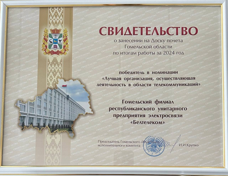 У ліку пераможцаў па выніках работы за 2024 год - Гомельскі філіял РУП «Белтэлекам» у намінацыі «Лепшая арганізацыя, якая ажыццяўляе дзейнасць у галіне тэлекамунікацый».