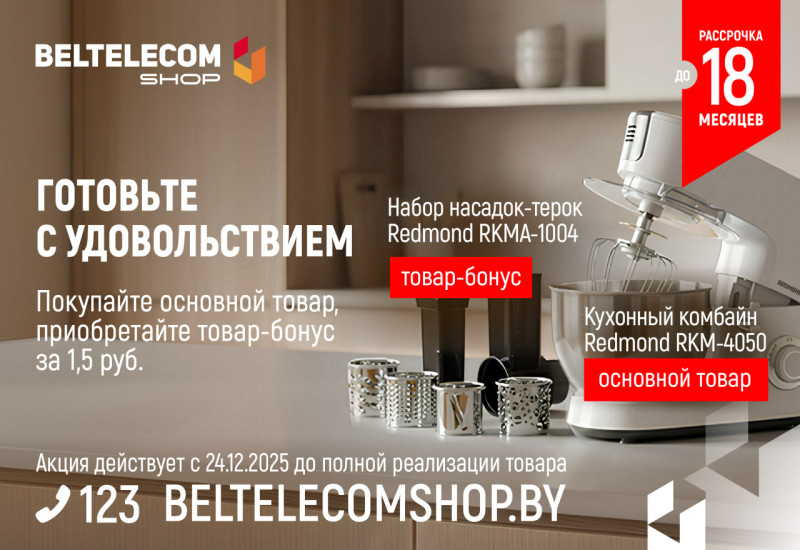 Набывайце ў BeltelecomShop чароўны камплект: магутны кухонны камбайн Redmond RKM-4050 + набор асадак-цёрак усяго за 1 руб. 50 кап. да яго!
