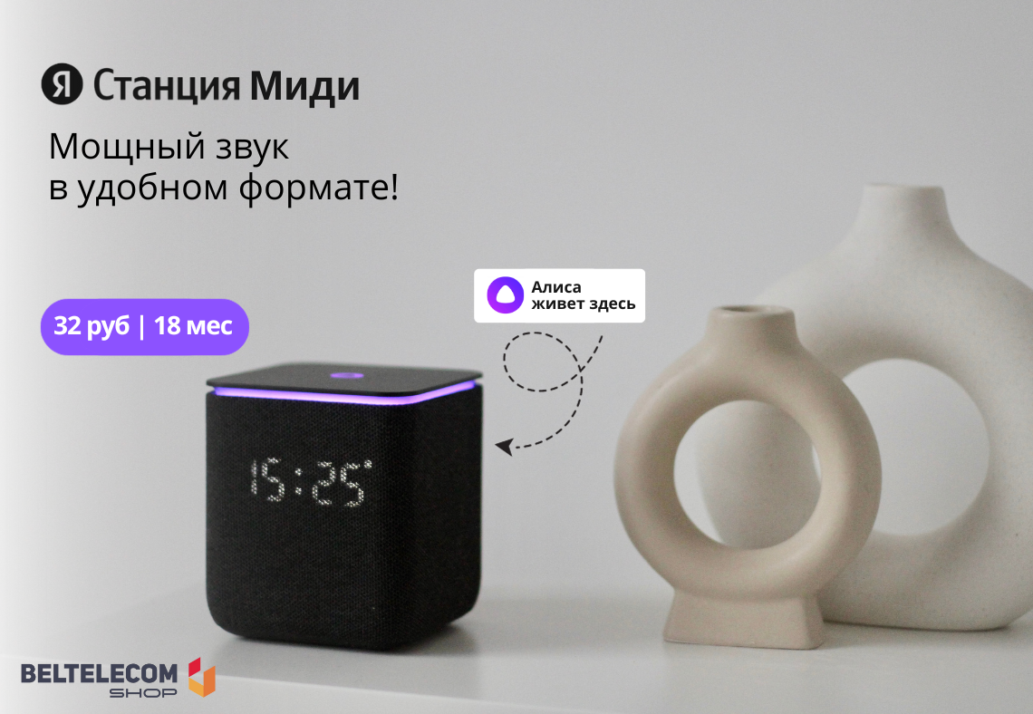 «Белтэлекам» радуе сваіх кліентаў навінкай на shop.beltelecom.by –Яндэкс.Станцыяй Мідзі. Гэта кампактная калонка з аб'ёмным гукам 24 Вт, галасавым асістэнтам Алісай і падтрымкай пратакола Zigbee. Абаненты «Белтэлекама» могуць набыць яе на выгадных умовах – у растэрміноўку на 18 месяцаў са штомесячным плацяжом 32 руб.