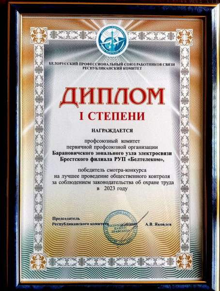 Поздравляем профсоюзный комитет первичной профсоюзной организации Барановичского ЗУЭС Брестского филиала РУП "Белтелеком" с победой в смотре-конкурсе на лучшее проведение общественного контроля за соблюдением законодательства об охране труда в 2023 году!