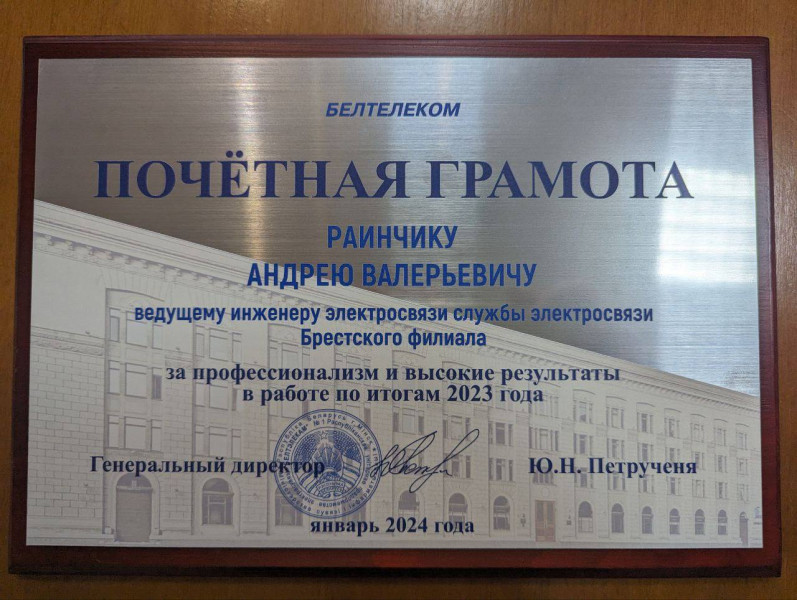 - Почетной грамотой награжден ведущий инженер электросвязи службы электросвязи Брестского филиала Раинчик Андрей Валерьевич