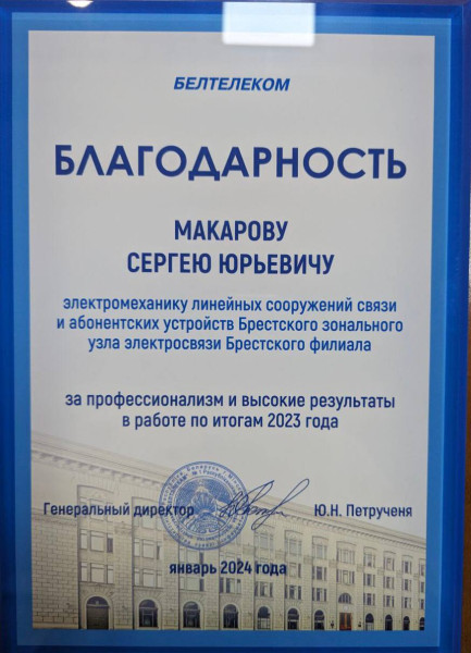 - Благодарность за профессионализм и высокие результаты в работе по итогам 2023 года получил электромеханик линейных сооружений связи и абонентских устройств Брестского ЗУЭС Макаров Сергей Юрьевич