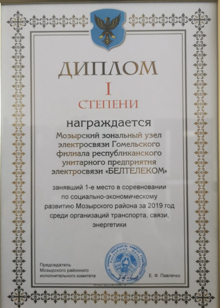 Мозырский зональный узел электросвязи стал победителем районного соревнования среди трудовых коллективов Мозырщины по социально-экономическому развитию Мозырского района за 2019 год среди организаций транспорта, связи и энергетики.