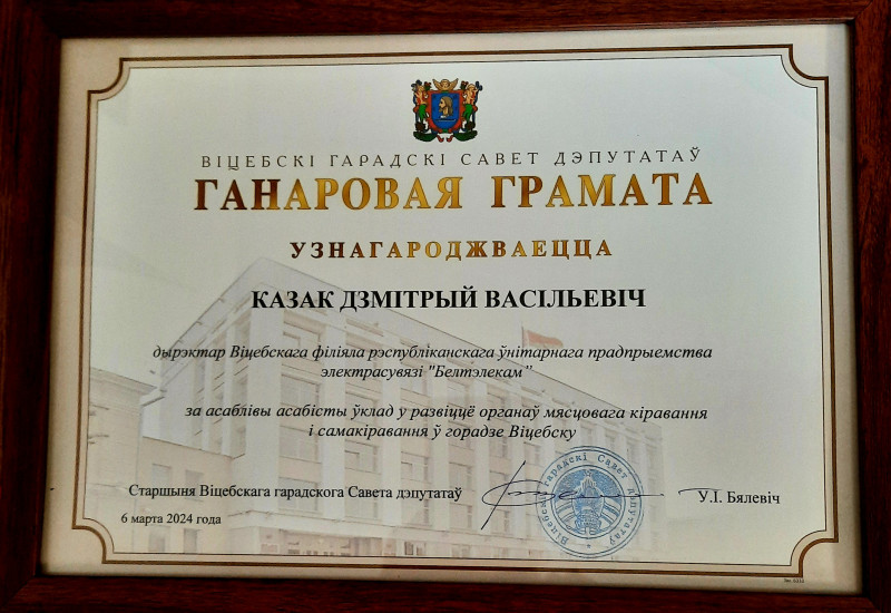 Почетной грамоты Витебского городского Совета депутатов за личный вклад в развитие органов местного управления в городе Витебске удостоен: